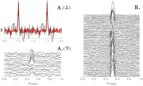 ▲ 新脉冲星的归一化平均脉冲轮廓和单脉冲:A(上)为FP1平均脉冲轮廓,FAST通过约52.4秒漂移扫描(红色)产生信噪比为Parkes望远镜L波段积分2100秒结果(灰色)信噪比的3倍,表现出FAST高灵敏度优势;A(下)为FP1单脉冲轮廓;B为FAST采用跟踪观测5分钟,获得的另一颗新脉冲星FP2的单脉冲轮廓。