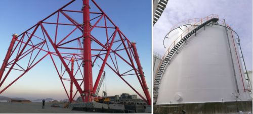 ▲ 左:世界最高输电塔涂装工程;右:大型原油储罐整体防腐涂装