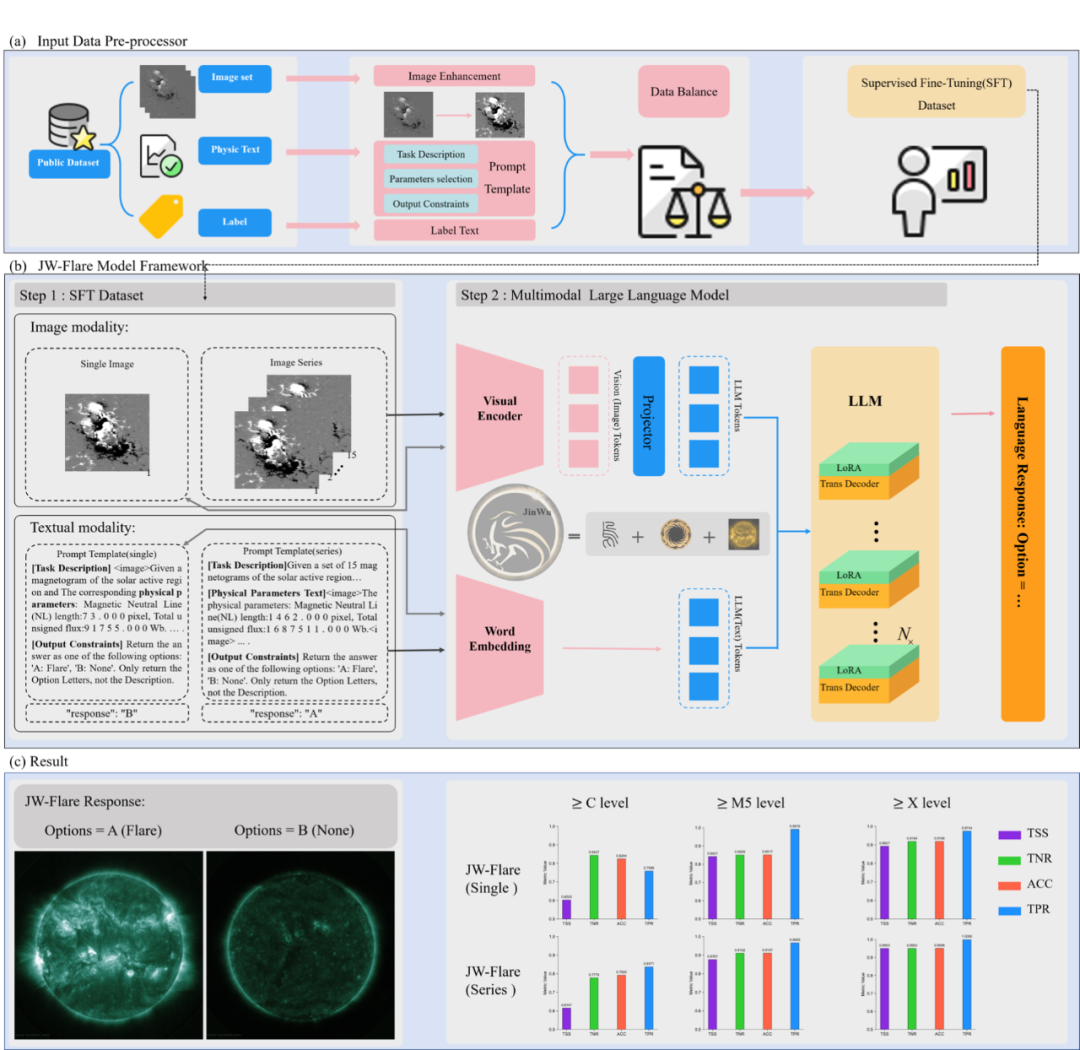 在耀斑预测方面,研究团队以SDO卫星公开数据、怀柔基地35厘米磁场望远镜数据和夸父一号(ASOS)全日面矢量磁像仪数据为主要数据源进行训练和测试。最终模型展现了卓越的性能,尤其是在X级耀斑的预测上,达到了95%的准确率和100%的真实阳性率。