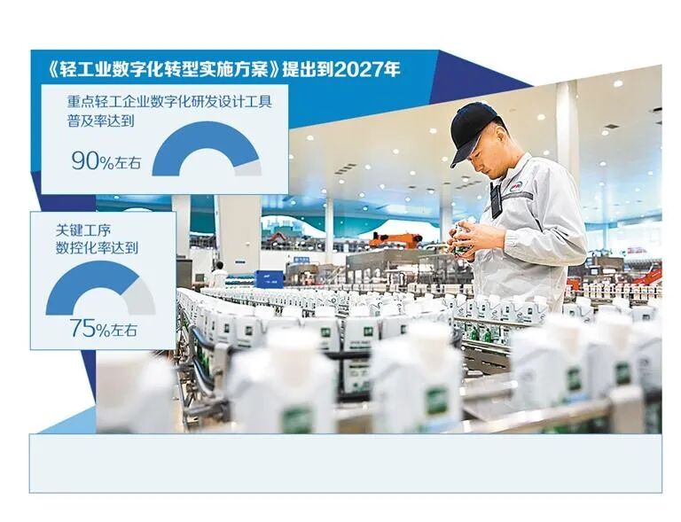 工业和信息化部、教育部、市场监管总局日前联合印发《轻工业数字化转型实施方案》(以下简称《实施方案》),提出到2027年,重点轻工企业数字化研发设计工具普及率达到90%左右,关键工序数控化率达到75%左右,打造100个左右典型场景,培育60家左右标杆企业,制定修订50项左右国家和行业标准,形成一批数字化转型成果。