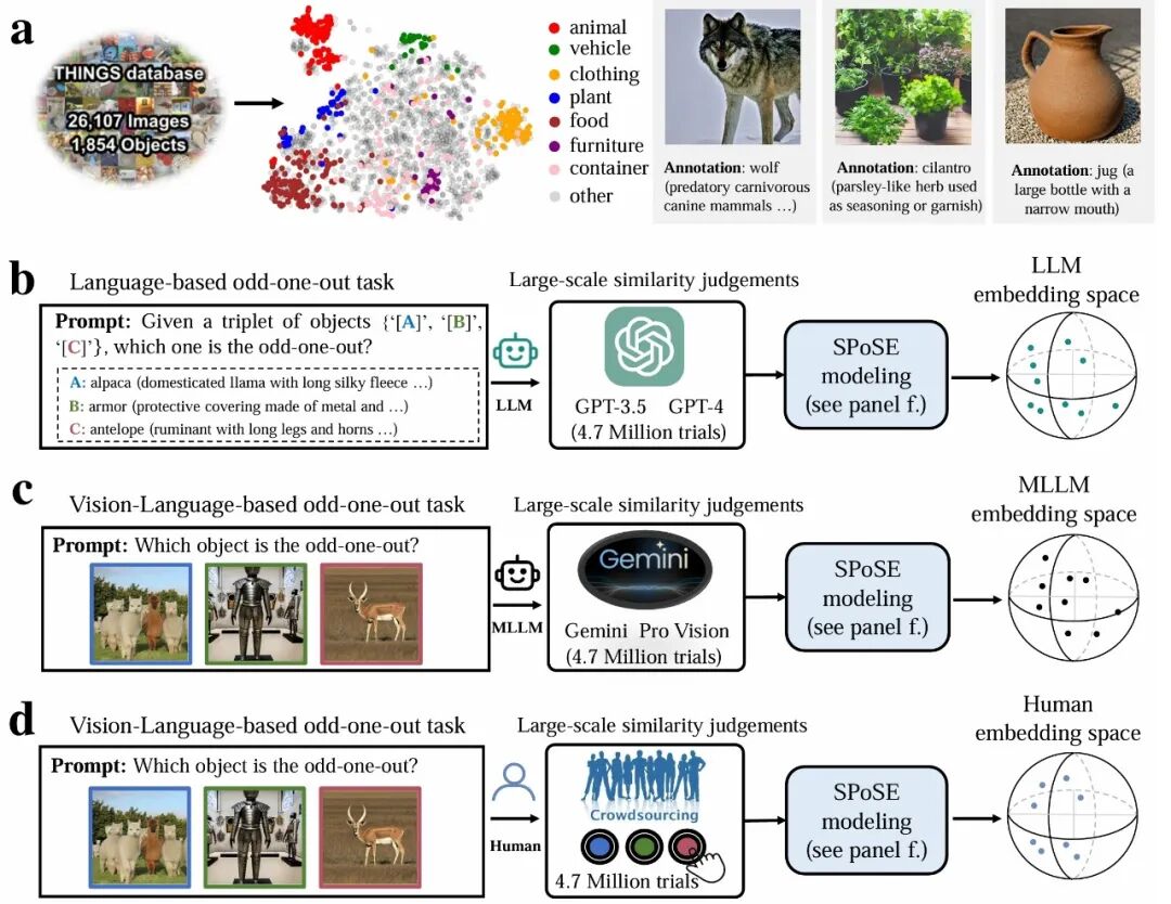 采用认知心理学经典的“三选一异类识别任务”(triplet odd-one-out),要求大模型与人类从物体概念三元组(来自1854种日常概念的任意组合)中选出最不相似的选项。团队通过分析470万次行为判断数据,首次构建了AI大模型的“概念地图”。