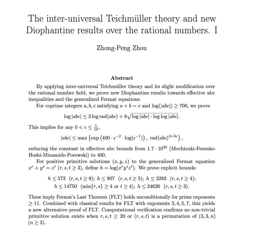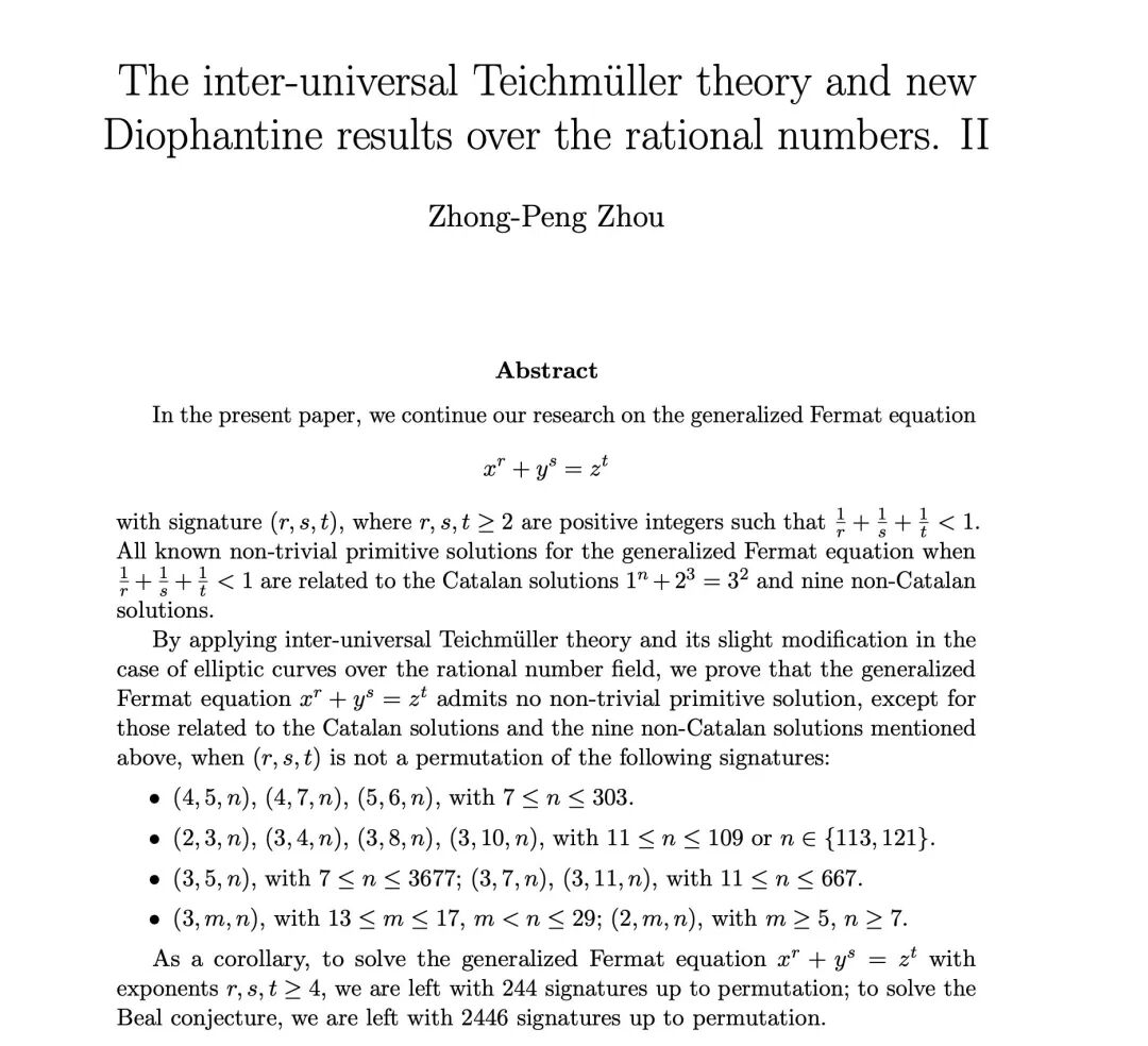 此后的5个月,周忠鹏将晚上所有的时间都留给了这项研究。终于,他写出了第一版论文草稿。在周忠鹏的论证中,IUT理论可以得到应用,用来证明广义费马大定理(约等于比尔猜想)等问题。