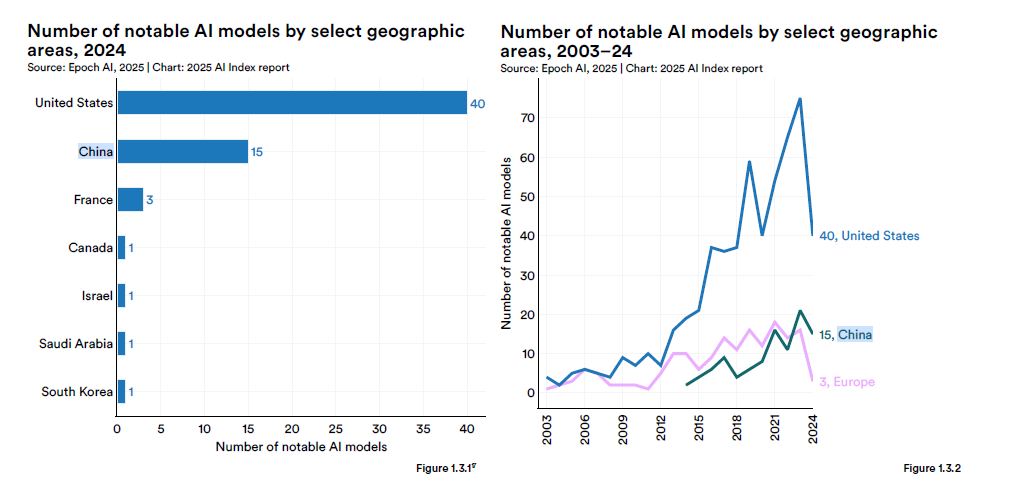 编者按 《斯坦福大学2025年人工智能指数报告》(Stanford University HAI AI Index Report 2025)(以下简称《报告》)作为斯坦福大学以人为本人工智能研究所(HAI)发布的第八版年度报告,提供了迄今为止最为全面的全球人工智能发展图景。 该报告在研究与开发、技术性能、负责任的人工智能、经济影响、科学与医学、教育、政策与治理、多样性以及公众舆论等多个章节中,都包含了大量涉及美国和中国的比较数据与分析。 通过系统梳理这些内容,可以清晰地看到中美两国在人工智能领域既有竞争又有合作,各自呈现出不同的优势、特点和发展路径。本期推送将详细阐述报告中呈现的中美在人工智能领域各个方面的主要差异与比较,全文6000字,预计阅读时间15分钟。