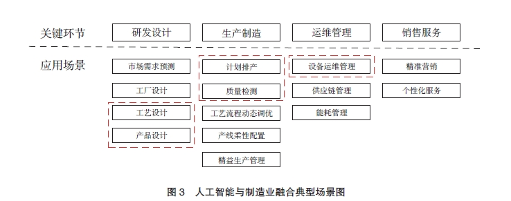 中国是全球唯一一个具备从最基础的原材料生产到高端制造业所有工业类别的国家,制造领域的应用场景丰富多元。人工智能的技术创新成果已经在制造业的产品与工艺的设计研发、生产线的智能制造、设备与系统的运维管理、市场营销和客户服务等多个环节中应用,涵盖产品设计、计划排产、质量检测、设备运维管理、营销服务和供应链管理等多个应用场景(见图3),其中产品设计和工艺设计、智能计划排产、智能质量检测和智能设备运维是人工智能和制造业融合的四大核心场景。