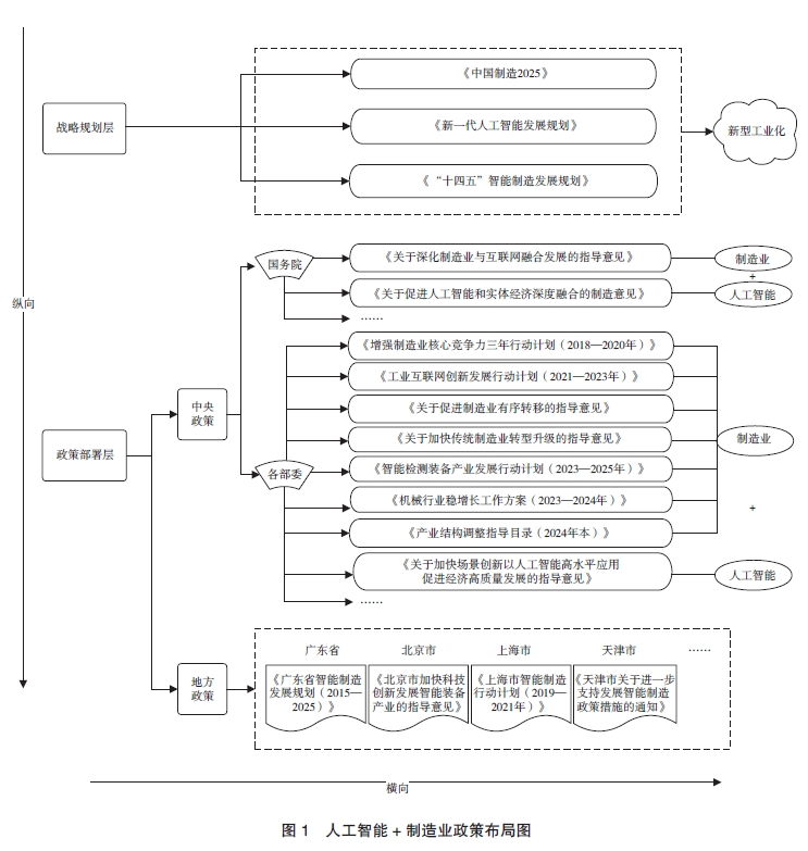 在国家战略层面,中国围绕建设制造强国的总体目标,加快部署人工智能赋能经济发展的一系列举措。2015年,国务院印发《中国制造2025》,确立了制造业转型升级的战略目标,提出了人工智能等新一代信息技术与制造业深度融合的重要举措,其核心是推动中国从制造业大国向制造业强国转变,全面提升中国制造的全球影响力。2016年,为加快推进制造业与人工智能等新一代信息技术融合发展,国务院印发了《关于深化制造业与互联网融合发展的指导意见》,有力推动智能制造、服务型制造和网络协同制造等新模式和新业态深入发展和广泛应用。2017年,国务院发布并实施《新一代人工智能发展规划》,明确提出要培育高端高效的智能经济,加快推进产业智能化升级改造,推动人工智能与制造等重点行业、领域加速融合和人工智能规模化应用,全面提升产业发展智能化水平。2019年《政府工作报告》中提出“智能+”;并在当年3月,中央全面深化改革委员会第七次会议审议通过了《关于促进人工智能和实体经济深度融合的指导意见》,以市场需求为导向,以产业应用为目标,加速推动人工智能赋能传统产业转型升级。《中华人民共和国国民经济和社会发展第十四个五年规划和2035年远景目标纲要》和党的二十大报告也都将制造强国放在重要地位。2024年1月,国务院研究部署推动人工智能赋能新型工业化相关工作,强调追求高质量发展和确保高水平安全相统一,以人工智能与制造业深度融合为主线,以制造领域的场景应用为牵引,加速推进制造领域重点场景的智能化转型与升级。同时,加快重点行业智能升级,大力发展智能产品,高水平赋能工业制造体系,加快形成新质生产力。