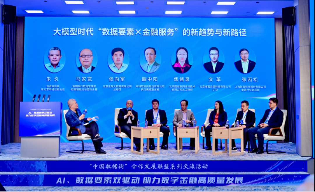 在圆桌对话环节,中国银行数据管理部数据智能分析团队主管马家宽,北京金融大数据有限公司总经理张向军,中科软科技股份有限公司执行高级副总裁谢中阳,北京国信新网通讯技术有限公司总工程师焦绪录,北京容联易通信息技术有限公司研发部副总经理、北京诸葛云游科技有限公司CTO文革,上海新致软件股份有限公司金融行业副总裁张丙松,围绕大模型时代“数据要素×金融服务”的新趋势与新路径、面临的堵点痛点问题以及应对举措等话题,进行了深入的对话交流。