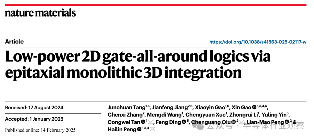 2月14日,北京大学化学与分子工程学院彭海琳教授团队与电子学院邱晨光研究员团队合作,研制出世界首例低功耗高性能二维环栅晶体管及逻辑单元,成果在《自然-材料》发表。该晶体管的速度和能效同时超过了硅基物理极限,是世界上迄今速度最快、能耗最低的晶体管。该工作有望推动芯片领域新一轮技术革新,为我国先进制程集成电路制造技术发展赢得主动。
