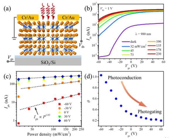 近日,中国科学院上海硅酸盐研究所先进材料与新能源应用研究团队与北京大学和华中科技大学共同合作,制备了新二维化合物RhI3,并从大块晶体中剥离出原子层厚度的RhI3薄片,研究其光学、电学性质和光探测行为。这种化合物表现出优越的空气和热稳定性,带隙的改变表现出与厚度的关联性(从1.1 (18L)到1.4 eV (2L) )。由少层RhI3薄片组成的场效应晶体管展现出n型半导体电学行为,载流子迁移率为2.5 cm2 V-1 s-1,开/关电流比为4×104。在室温下空气环境中,RhI3光电探测器在980 nm的光照下具有11.5 A W-1的响应率和2×10 Jones的高特异检出率。这些结果表明了原子薄RhI3薄片在未来2D电子和光电子器件中具有各种潜在应用。相关研究成果以Honeycomb RhI3 Flakes with High Environmental Stability for Optoelectronics为题发表在Advanced Materials上,论文共同第一作者为华中科技大学博士研究生王发坤和上海硅酸盐所博士研究生张壮,共同通讯作者为上海硅酸盐所研究员黄富强和华中科技大学教授翟天佑。