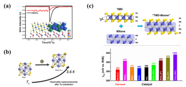 继新型二维化合物RhI3之后,研究团队在新化合物合成探索方面取得持续新进展。上海硅酸盐所博士研究生王阳通过高温固相法合成了新的五元氧硒杂阴离子化合物Sr4Pb1.5Sb5O5Se8,在中红外非线性光学和材料研究领域具有重要科学意义,相关研究成果以Sr4Pb1.5Sb5O5Se8 a new mid-infrared nonlinear optical material with a moderate SHG response为题发表在期刊CrystEngComm上。上海硅酸盐所硕士研究生林峰制备了新的希尔夫相的超导化合物Mo6S6.8Te1.2,在凝固态物理和材料研究领域具有重要科学价值,相关研究成果以Superconductivity in Electron-doped Chevrel-Phase Compound Mo6S6.8Te1.2为题发表在Inorganic Chemistry上。上海硅酸盐所硕士研究生庞鑫从晶体结构出发,设计了一种具有“TMD-MXene”独特结构的层状材料Nb2Se2C作为电催化剂,并表现出优于目前绝大多数TMD、Mxene及两者复合的材料的电催化性能,相关研究成果以Nb2Se2C: a new compound as a combination of transition metal dichalcogenide and MXene for oxygen evolution reaction为题发表在Chemical Communications上。