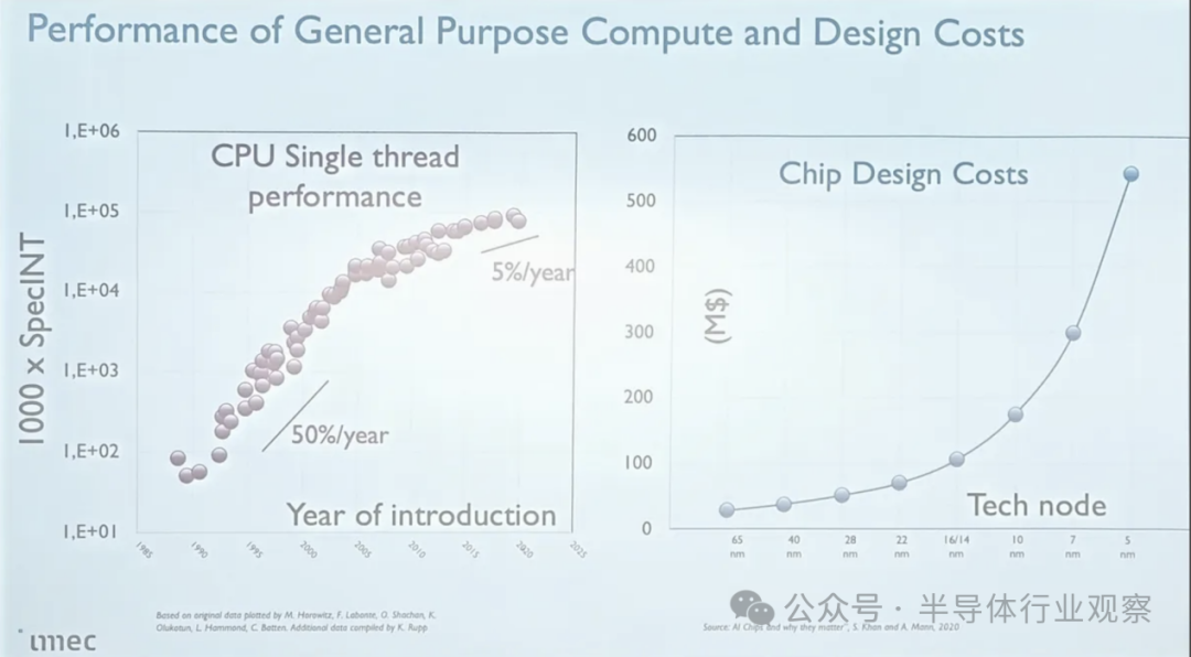 随着节点的进步、成本的飙升以及对更多计算能力的需求(特别是机器学习的需求)呈非线性增长,该行业面临着越来越多的挑战。但Imec完全相信摩尔定律在提出 50多年后仍然有效,尽管我们认为这并不适用于该定律的经济部分,该部分也定义了随着时间的推移每个晶体管的成本降低。