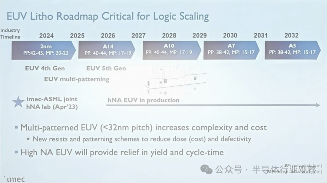 Imec认为,第一步是启用下一代工具。当今的第四代 EUV 光刻机的孔径为 0.33,因此芯片制造商必须使用多重图案化技术(每层曝光一次以上)来创建 2nm 及以下的最小特征。由于单层晶圆必须“打印”两次,因此出现缺陷的可能性更高。这将导致产量降低和周期(生产)时间延长,从而导致成本增加。