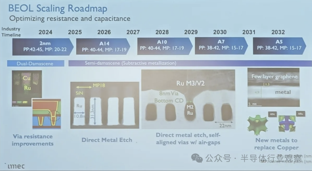 路线图上的进一步改进包括用于互连的直接金属蚀刻技术,以及带有气隙的自对准通孔。互连,即实现电力传输和通信的微型导线,已成为规模化的最大障碍之一。随着时间的推移,这个问题变得越来越明显——这些导线的宽度只需要几个原子厚。Imec 还在研究将取代铜的新金属,石墨烯就是候选材料之一。