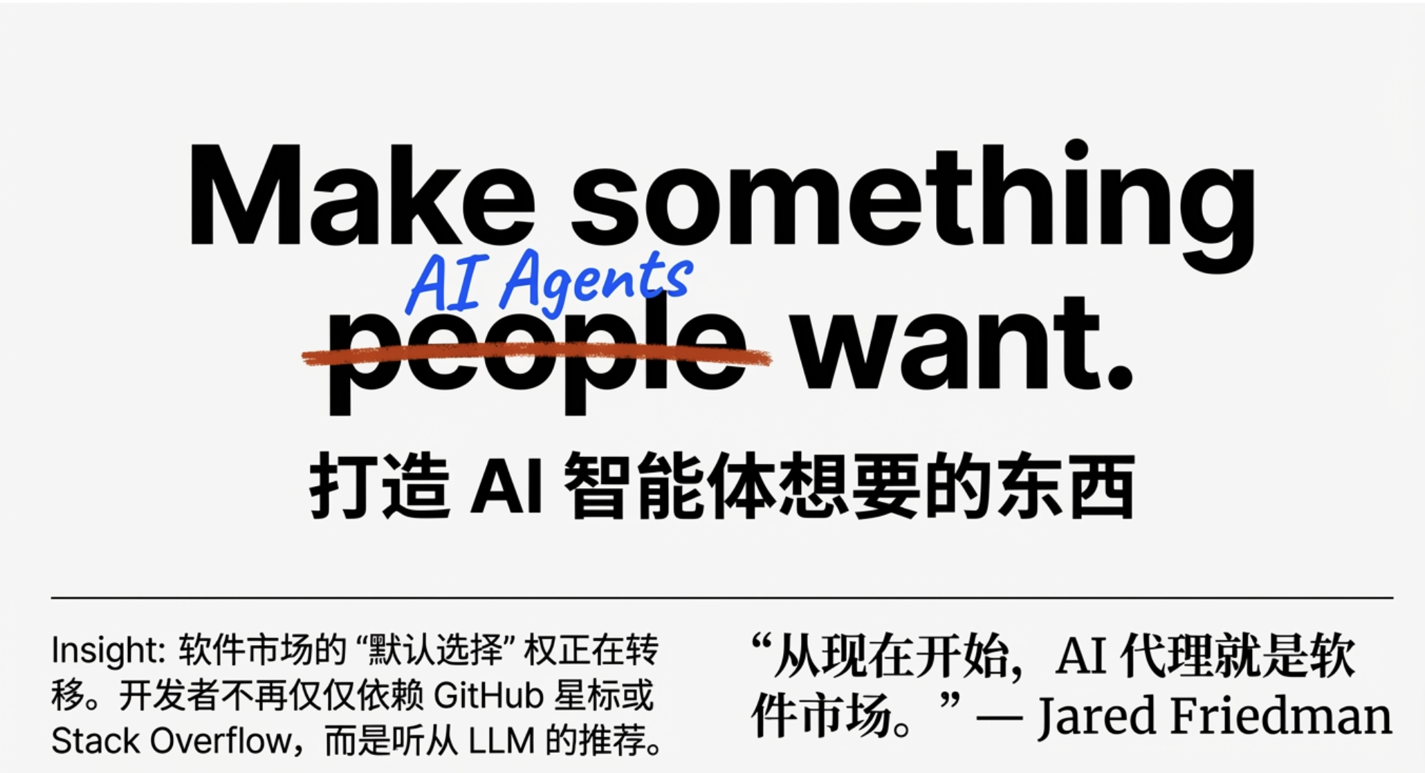 围绕开发者工具的竞争格局,YC把焦点放在一个判断上:软件的“默认选择”正在从人类开发者社区,迁移到LLM/代理的推荐与调用路径。Jared Friedman提到一条推文的观点:“从现在开始,AI代理就是软件市场。”Diana Hu随即把YC经典口号“Make something people want”改写为一句更直接的版本:“打造AI代理想要的东西。”