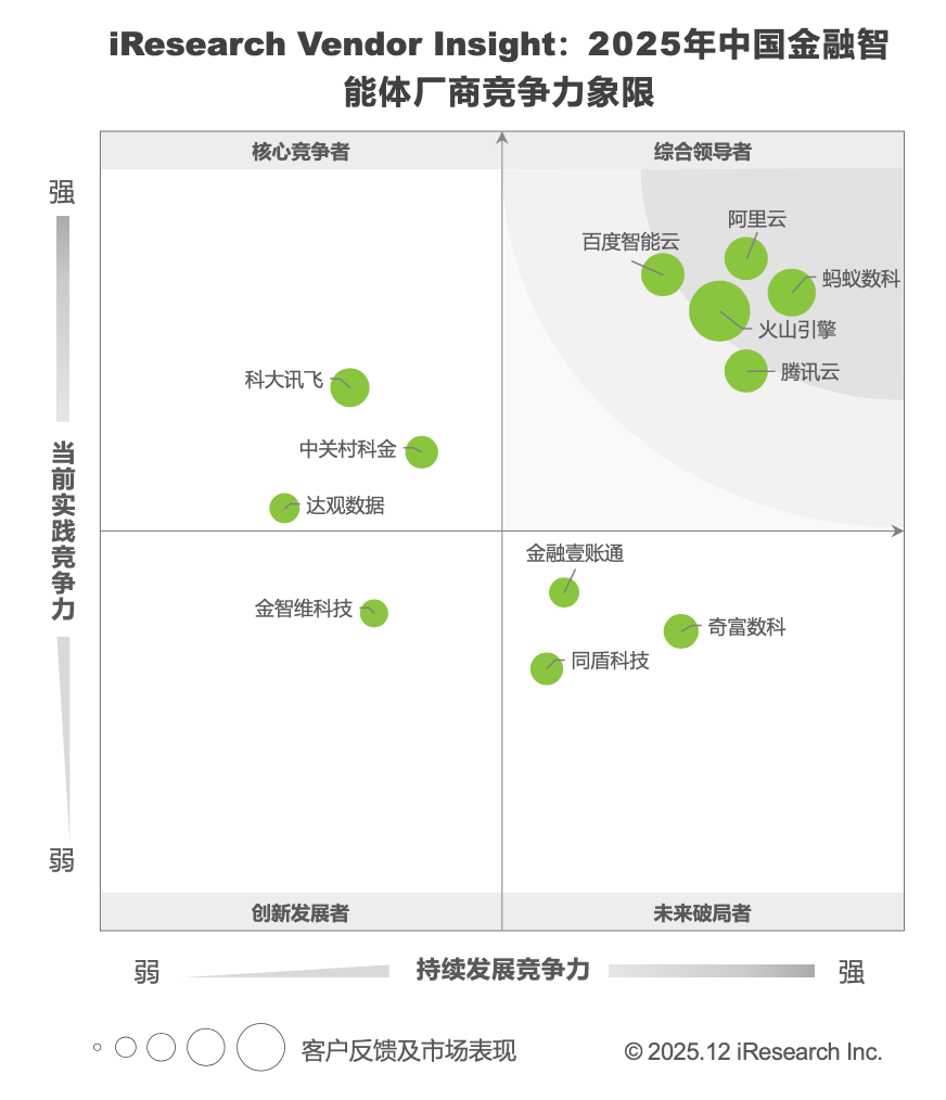 火山引擎同样位于综合领导者象限,其一站式智能体中台HiAgent基于Agent DevOps理念,提供全生命周期管理,支持高/低代码快速搭建生产级智能体。DataAgent通过Data+AI融合实现金融实时数据分析。火山引擎还推出智能体落地陪跑服务,助力金融机构加速AI应用。